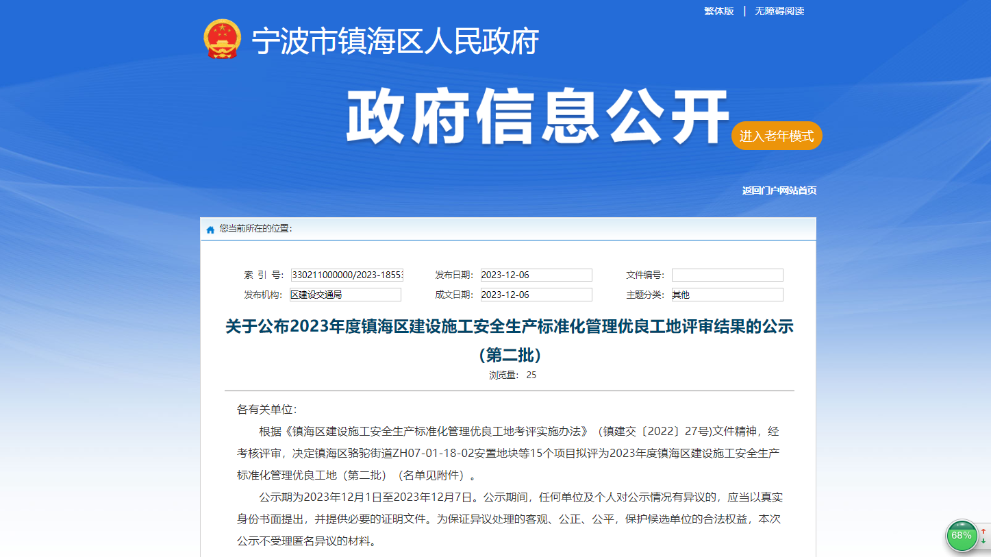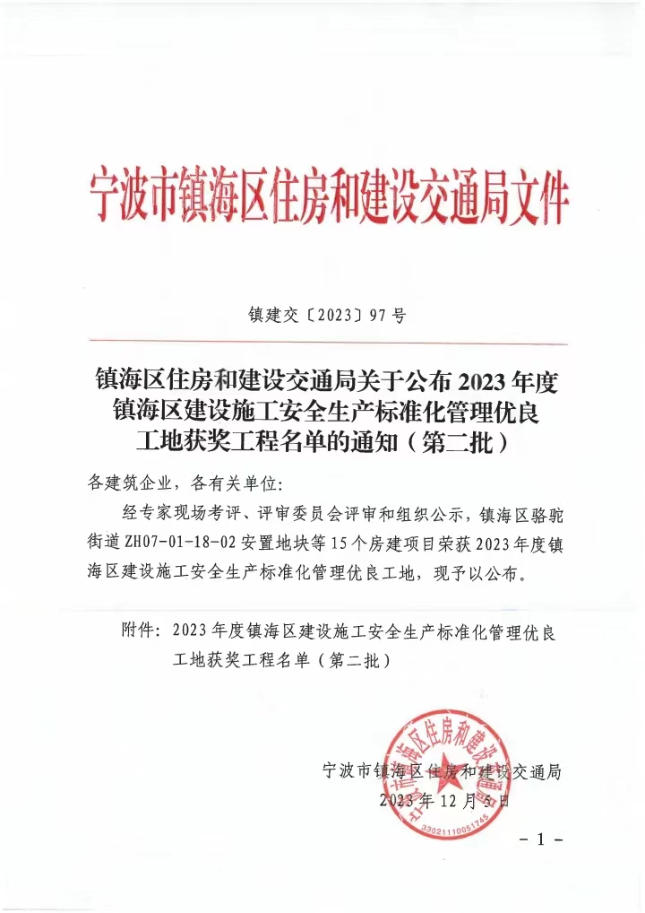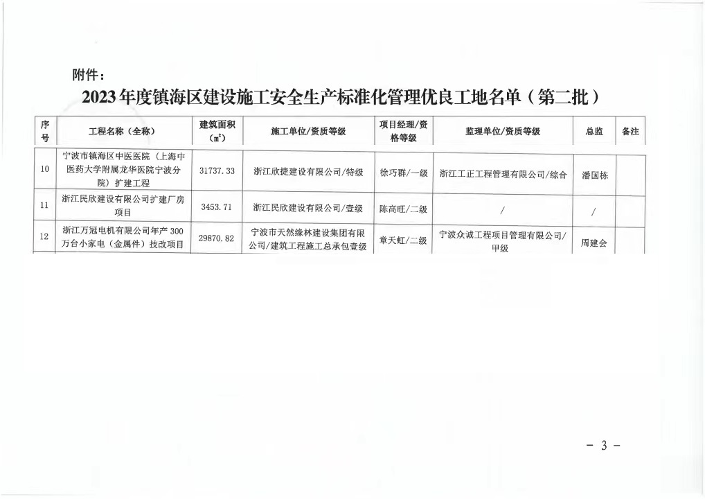 12月5日,寧波市鎮(zhèn)海區(qū)住房和城鄉(xiāng)建設(shè)交通局發(fā)布《關(guān)于公布2023年度鎮(zhèn)海區(qū)建設(shè)施工安全生產(chǎn)標(biāo)準(zhǔn)化管理優(yōu)良工地獲獎工程》文件通知,由我眾誠工程公司監(jiān)理的浙江萬冠電機(jī)有限公司年產(chǎn)300萬臺小家電整機(jī)(金屬件)技改項(xiàng)目獲得“2023年度建筑施工安全生產(chǎn)標(biāo)準(zhǔn)化工地”榮譽(yù)稱號。