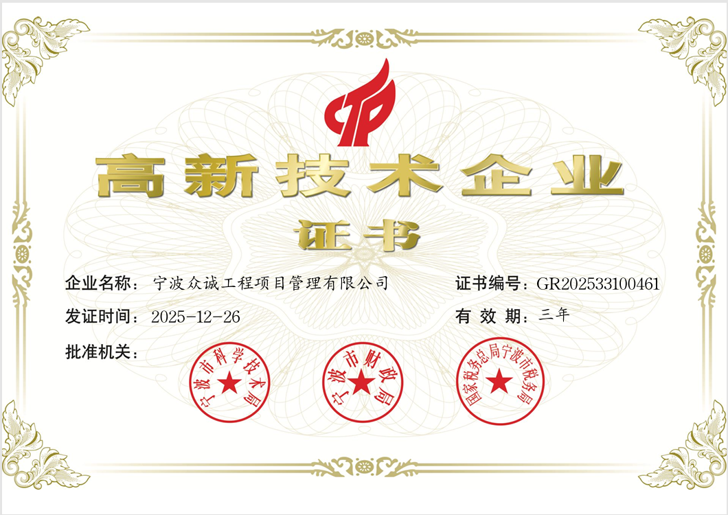 近日,寧波眾誠(chéng)工程項(xiàng)目管理有限公司(以下簡(jiǎn)稱“寧波眾誠(chéng)工程”)順利通過(guò)國(guó)家高新技術(shù)企業(yè)認(rèn)定,正式獲頒《高新技術(shù)企業(yè)證書》(證書編號(hào):GR202533100461),認(rèn)定有效期三年。此次認(rèn)定由寧波市科學(xué)技術(shù)局、寧波市財(cái)政局、國(guó)家稅務(wù)總局寧波市稅務(wù)局聯(lián)合審核批準(zhǔn),是對(duì)公司在工程項(xiàng)目管理領(lǐng)域技術(shù)創(chuàng)新、研發(fā)能力及成果轉(zhuǎn)化水平的權(quán)威認(rèn)可。