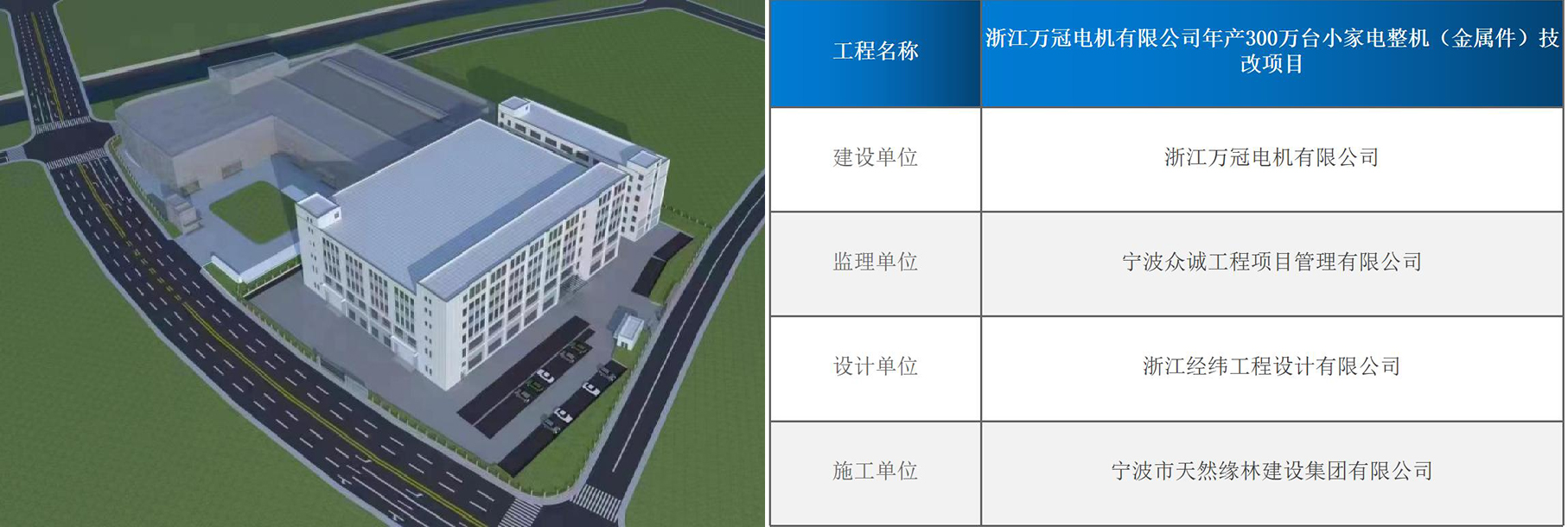 > 浙江萬(wàn)冠電機(jī)有限公司年產(chǎn)300萬(wàn)臺(tái)小家電整機(jī)(金屬件)技改項(xiàng)目
